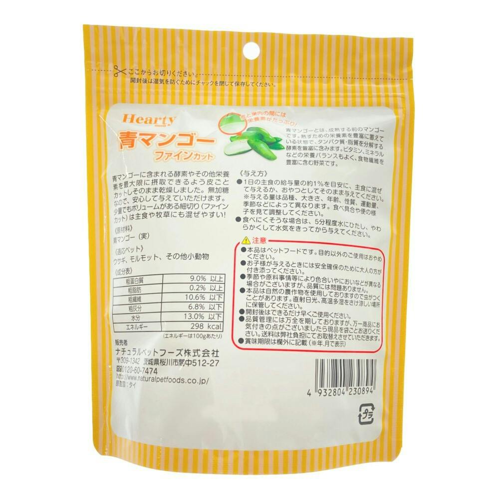青マンゴ-に含まれる酵素やその他栄養素を最大限に摂取できるように皮ごとカットしそのまま乾燥しました。無加糖なので、安心して与えていただけます。少量でもボリュ-ムがある細切り(ファインカット)は主食や牧草にも混ぜやすい!