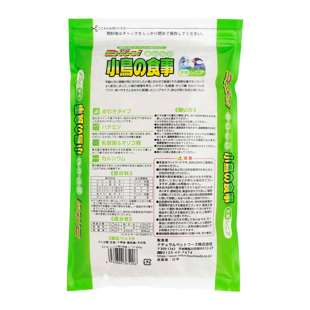 年齢と共に健康が気になりだした小鳥に合わせて厳選された新鮮な種子をバランスよく配合しました。小鳥の健康を考え、ハチミツ・乳酸菌・オリゴ糖・カルシウムをプラス!食べやすさとおなかに配慮したシニアタイプ。消化が気になる小鳥にも◎