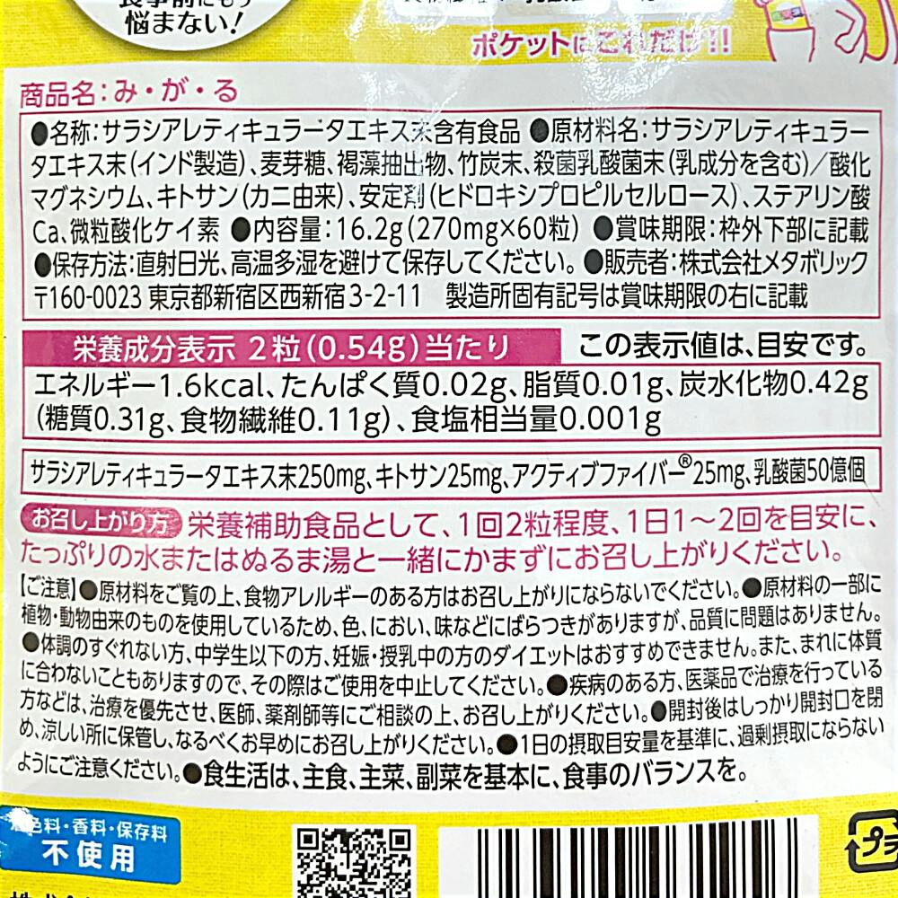 ●2粒(0.54g)当たり(この表示値は目安です)/エネルギー:1.6kcal、たんぱく質:0.02g、脂質:0.01g、炭水化物:0.42g(糖質:0.31g、食物繊維:0.11g)、食塩相当量:0.001g ●サラシアレティキュラータエキス末:250mg、キトサン:25mg、アクティブファイバー:25mg、乳酸菌50億個