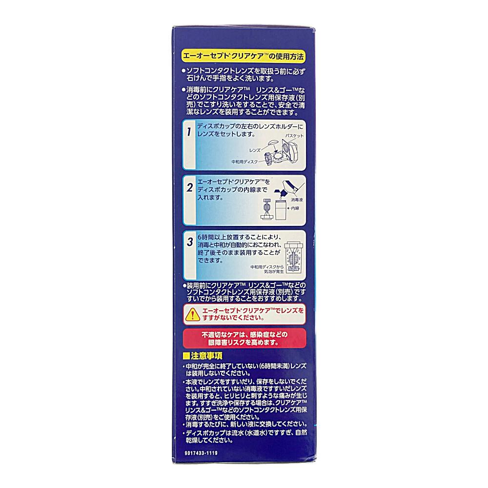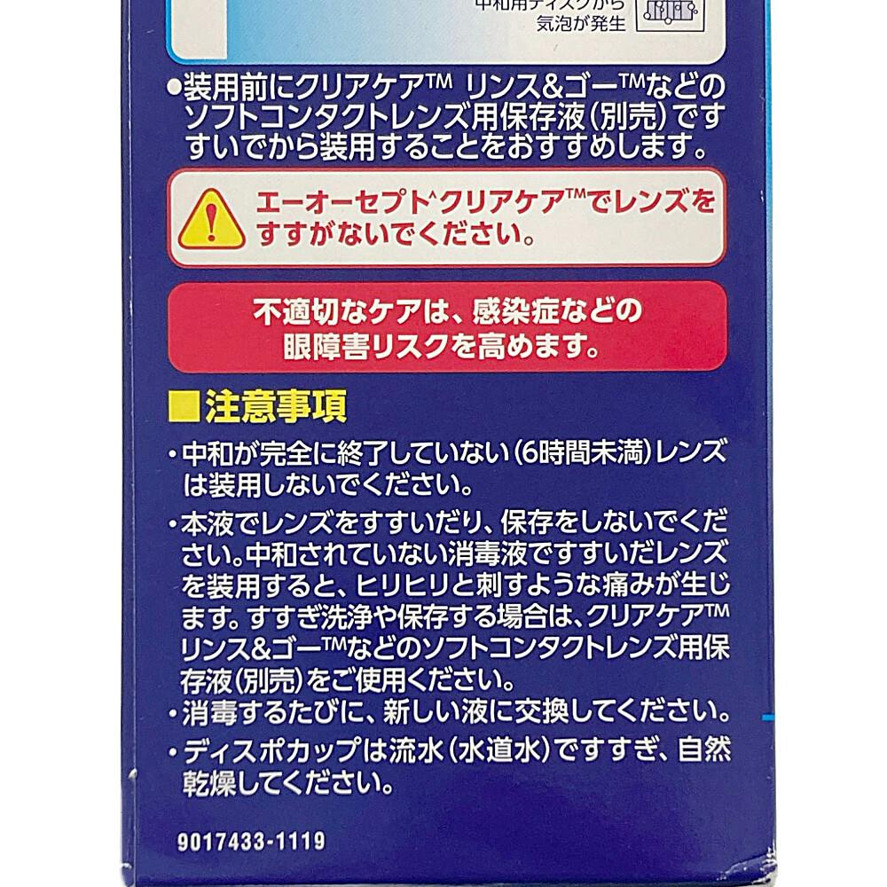 ●本剤を使用の際は同梱のエーオーセプトクリアケアTM専用ディスポカップを必ずご使用ください。中和のシステムが異なるため、それ以外のレンズケースは使用しないでください ●1本の消毒液使いきる毎に、同梱の新しいディスポカップに必ず取り替えてください