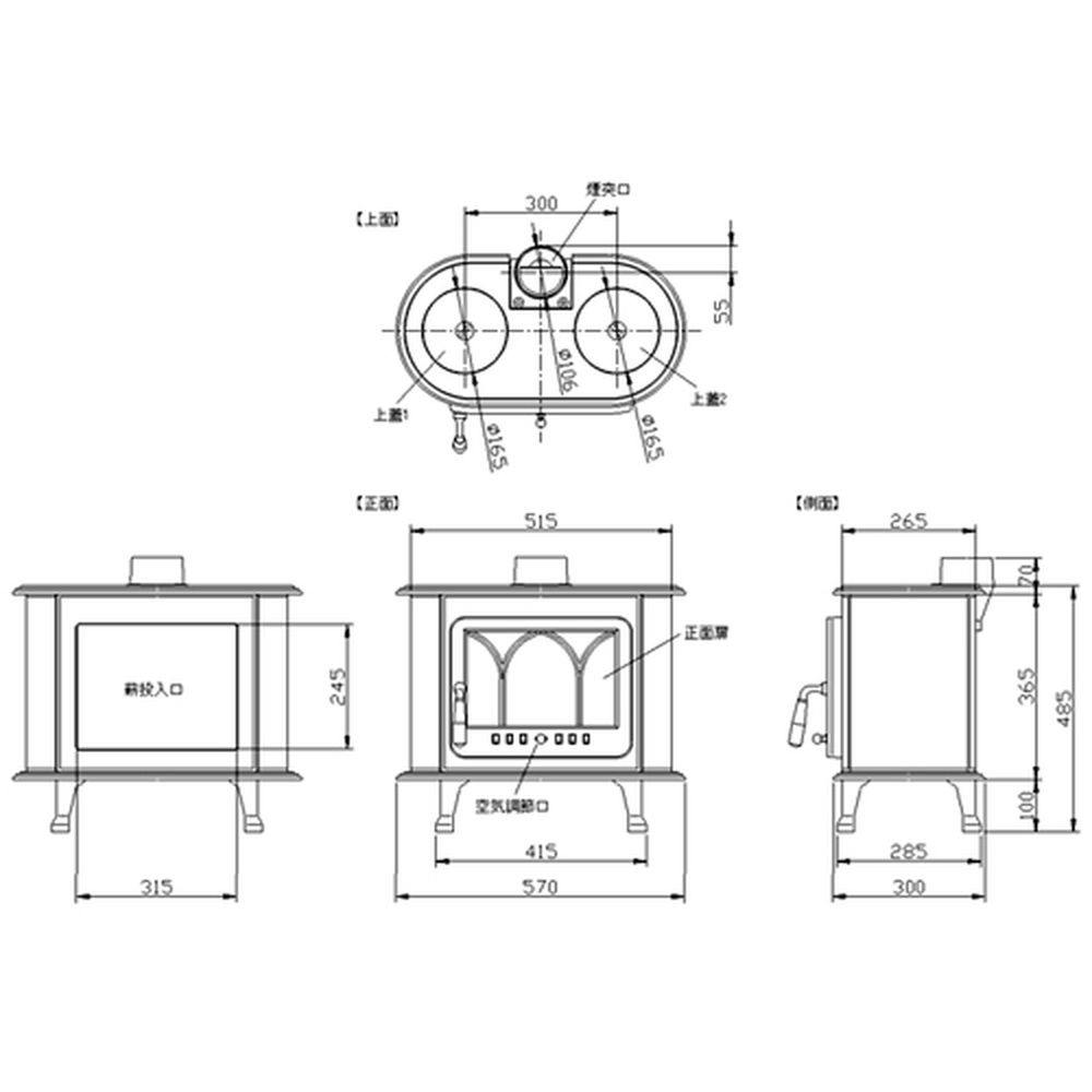 ●材質:鋳鉄 ●使用燃料:乾燥薪 ●最大薪長さ:400mm ●最大熱出力:約3.7kW(MAX) ●煙突径:φ106mm ●暖房面積:10~15坪目安 ●煙突位置:上部 ●燃焼方式:輻射式