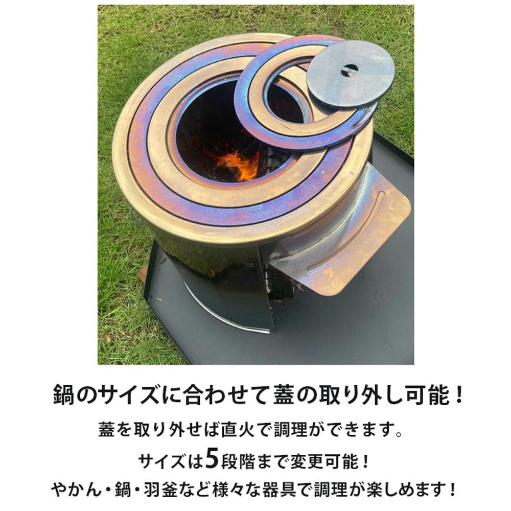 鍋のサイズに合わせて蓋の取り外し可能! 蓋を取り外せば直火で調理ができます。 サイズは5段階まで変更可能! やかん・鍋・羽釜など様々な器具で調理が楽しめます!
