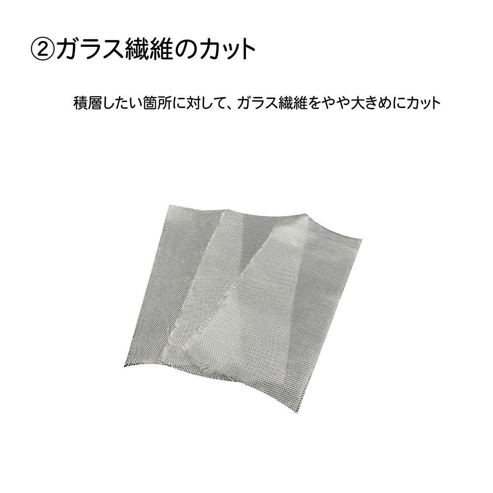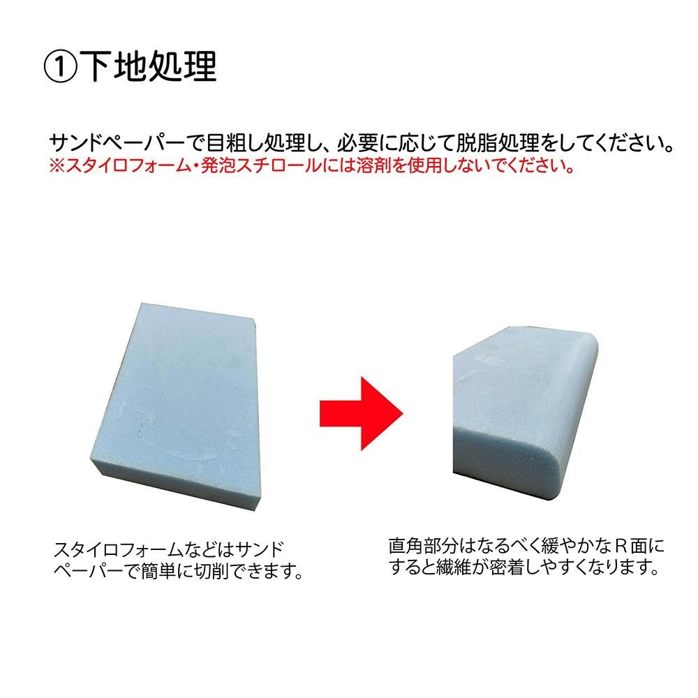 主剤と硬化剤を2:1の割合で混合し、かくはんします。ガラス繊維に染み込ませ、脱泡することでFRPになります。
