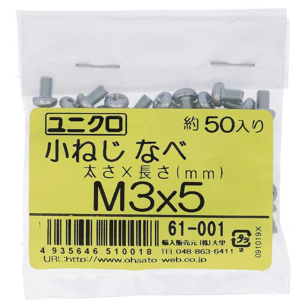 小ねじ なべ ユニクロ 61-001 M3×5mm 50本入 袋売