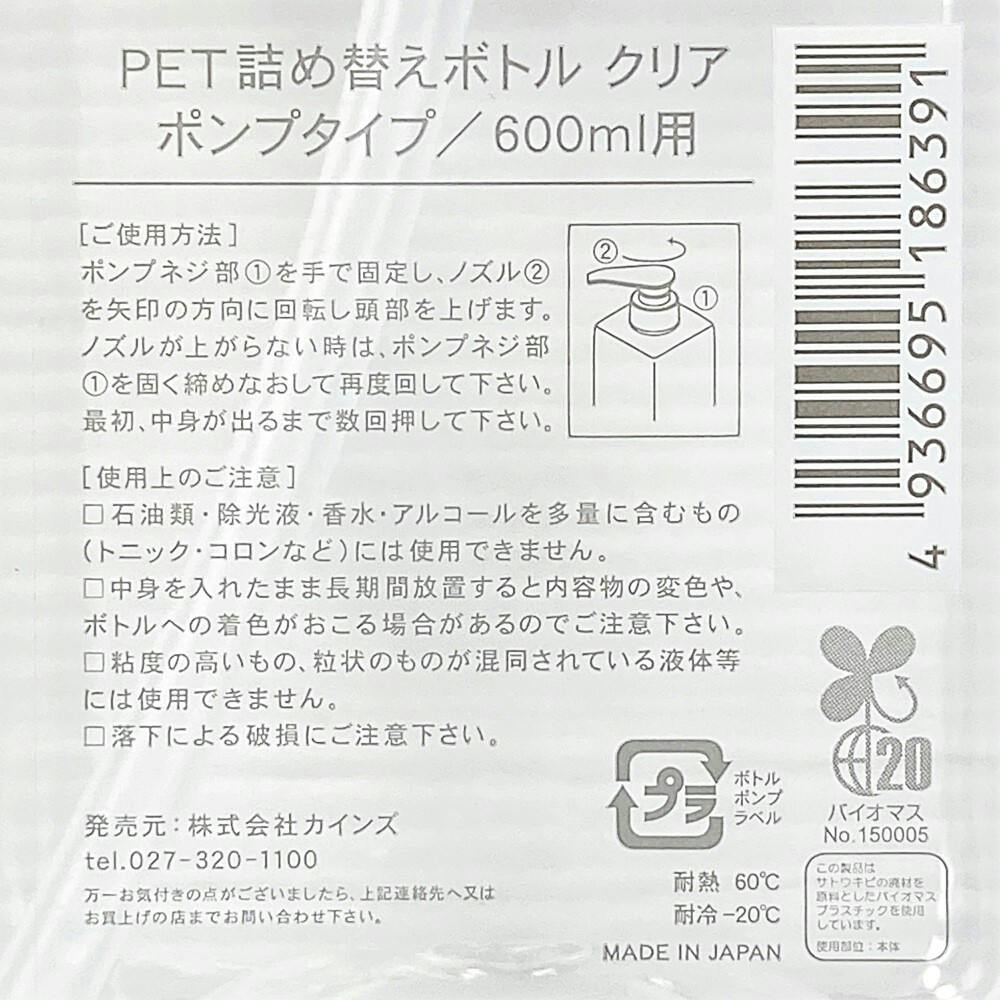 PET詰替ボトル ポンプタイプ 600ml クリア