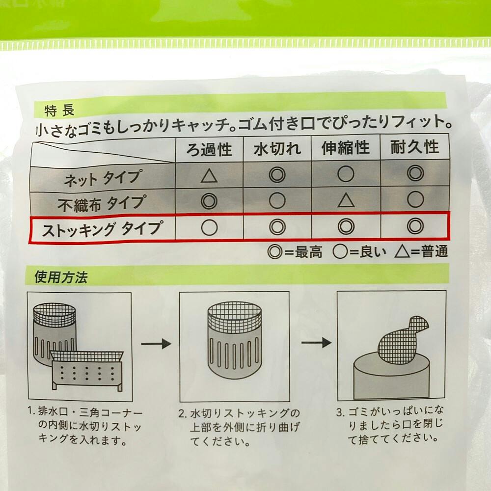 ①排水口・三角コーナーの内側に水切りストッキングを入れます。②水切りストッキングの上部を外側に折り曲げてください。③ゴミがいっぱいになりましたら口を閉じて捨ててください。