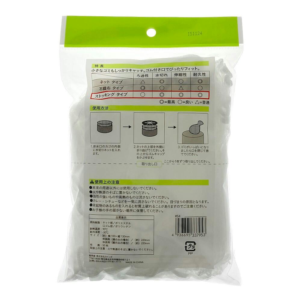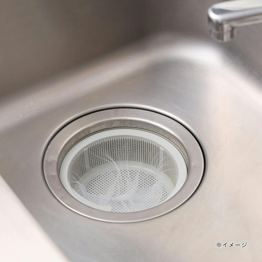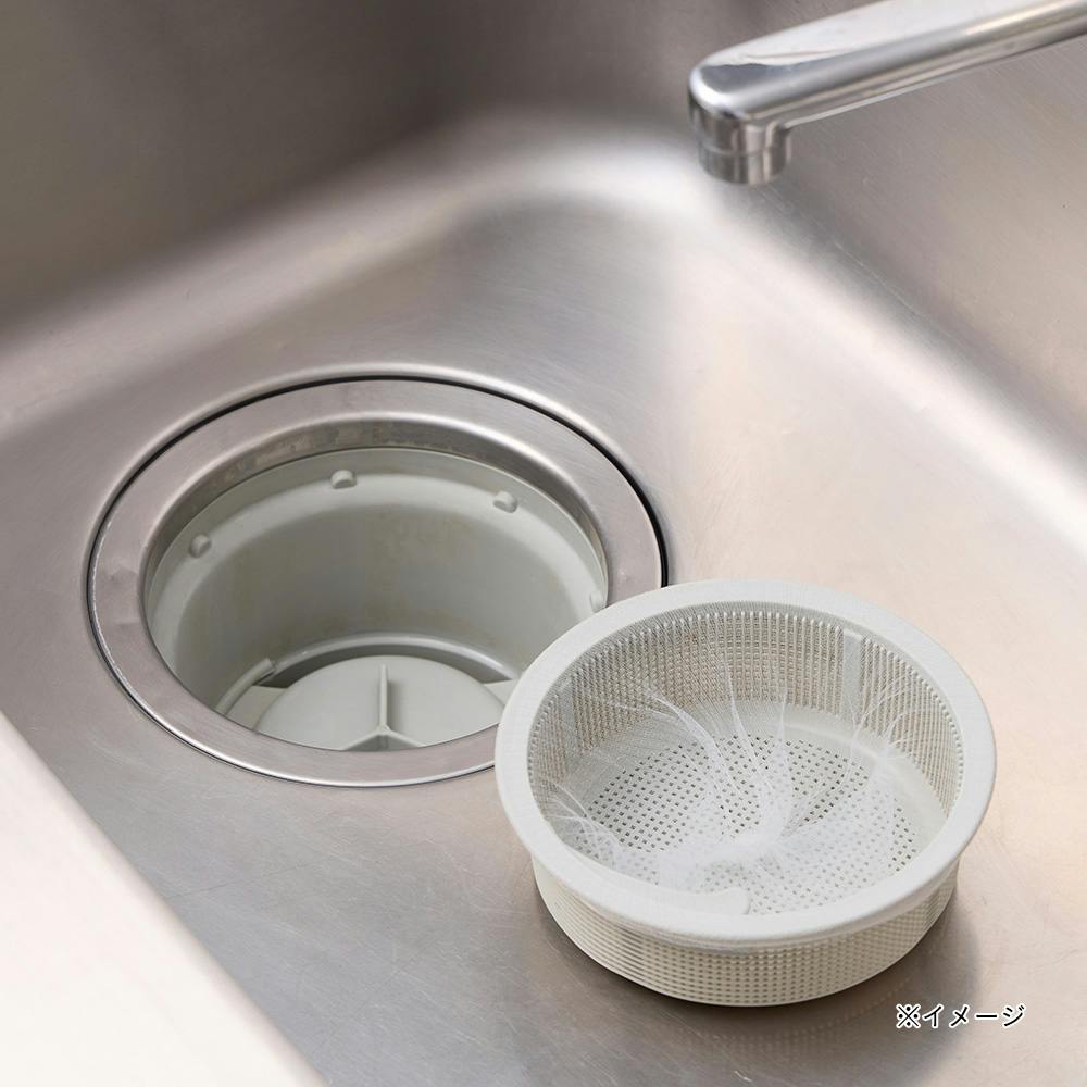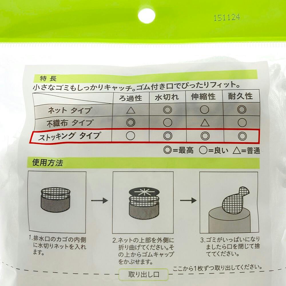 ①排水口のカゴの内側に水切りストッキングを入れます。②水切りストッキングの上部を外側に折り曲げてください。その上からゴムキャップをかぶせます。③ゴミがいっぱいになりましたら口を閉じて捨ててください。