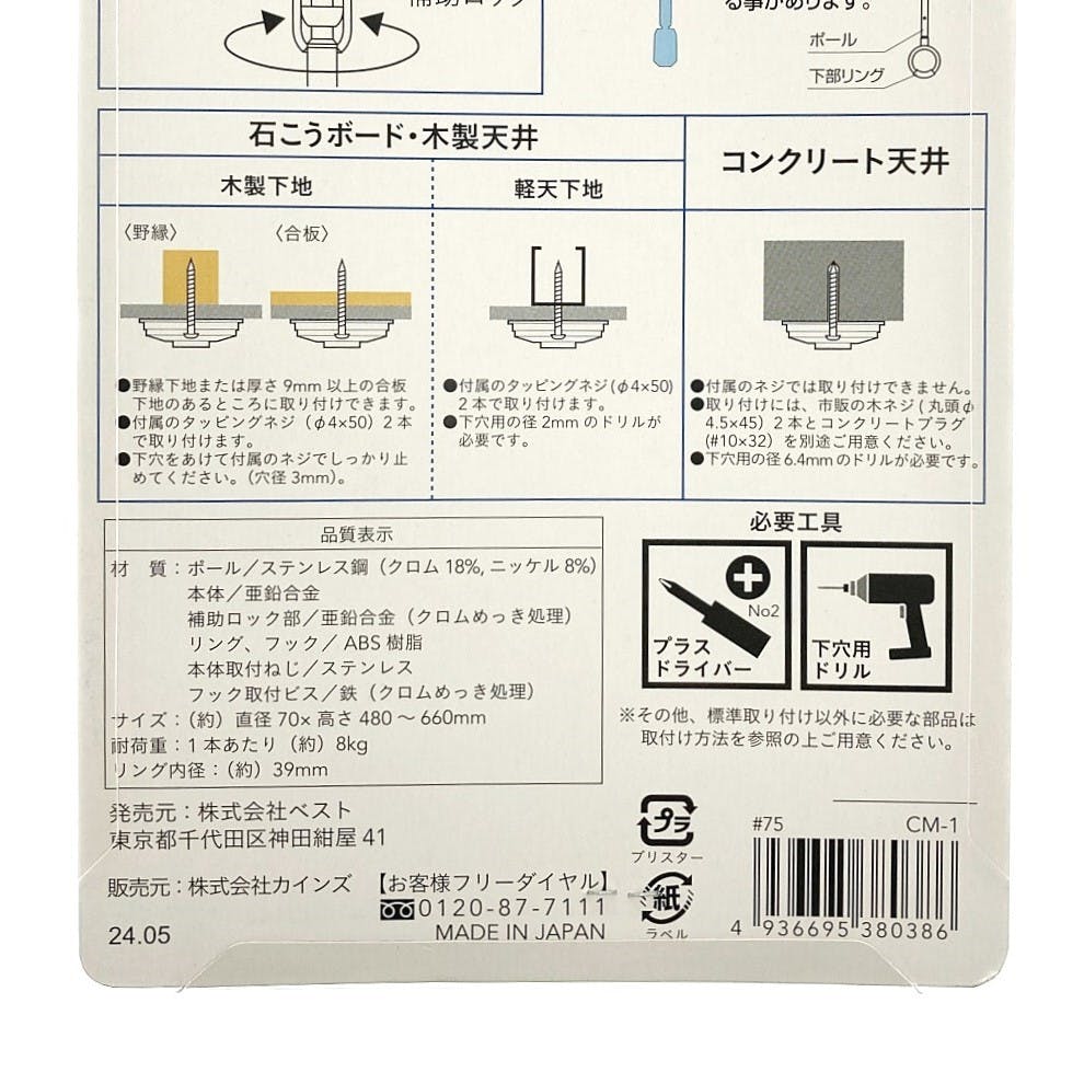 ●ポール/ステンレス鋼(クロム:18%、ニッケル:8%) ●本体/亜鉛合金 ●補助ロック部/亜鉛合金(クロムめっき処理) ●リング、フック/ABS樹脂 ●本体取付ねじ/ステンレス ●フック取付ビス/鉄(クロムめっき処理)