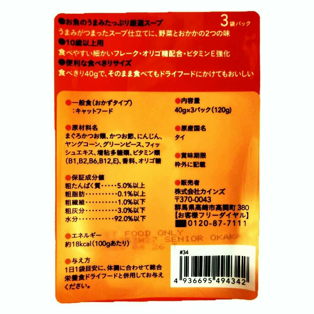 ●お魚のうまみたっぷり厳選スープ/うまみがつまったスープ仕立てに、野菜とおかかの2つの味●10歳以上用/食べやすい細かいフレーク・オリゴ糖配合・ビタミンE強化●便利な食べきりサイズ/食べ切り40gで、そのまま食べてもドライフードにかけてもおいしい