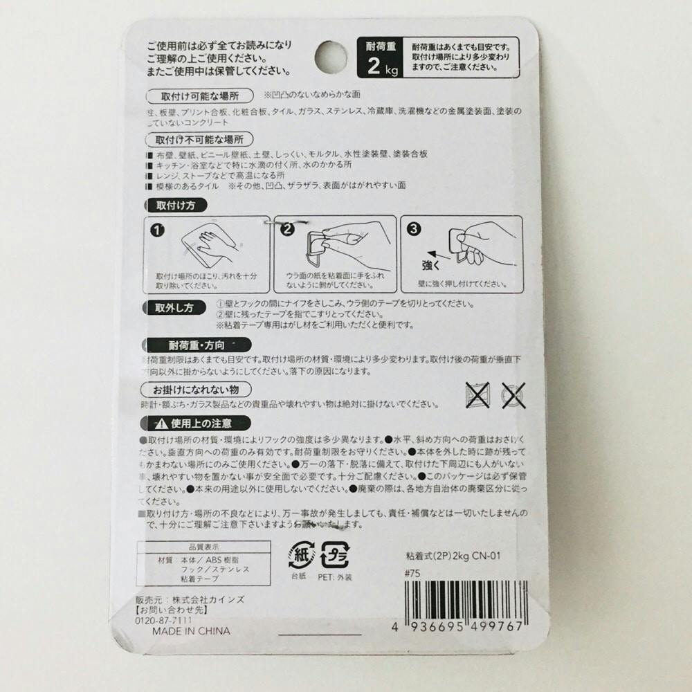 ●取付け場所の材質・環境によりフックの強度は多少異なります。●水平、斜め方向への荷重はお避けください。垂直方向への荷重のみ有効です。耐荷重制限をお守りください。●本体を外した時に跡が残ってもかまわない場所にのみご使用ください。