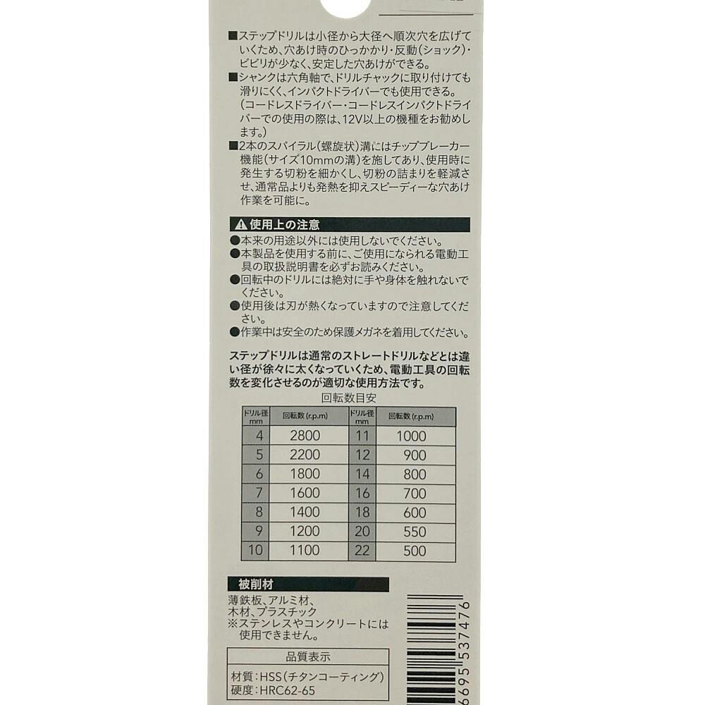 ●本来の用途以外には使用しないでください。●本製品を使用する前に、ご使用になられる電動工具の取扱説明書を必ずお読みください。●回転中のドリルには絶対に手や身体を触れないでください。●使用後は刃が熱くなっていますので注意してください。