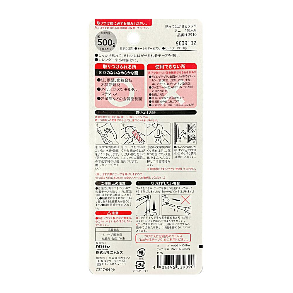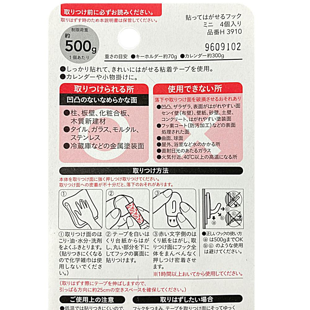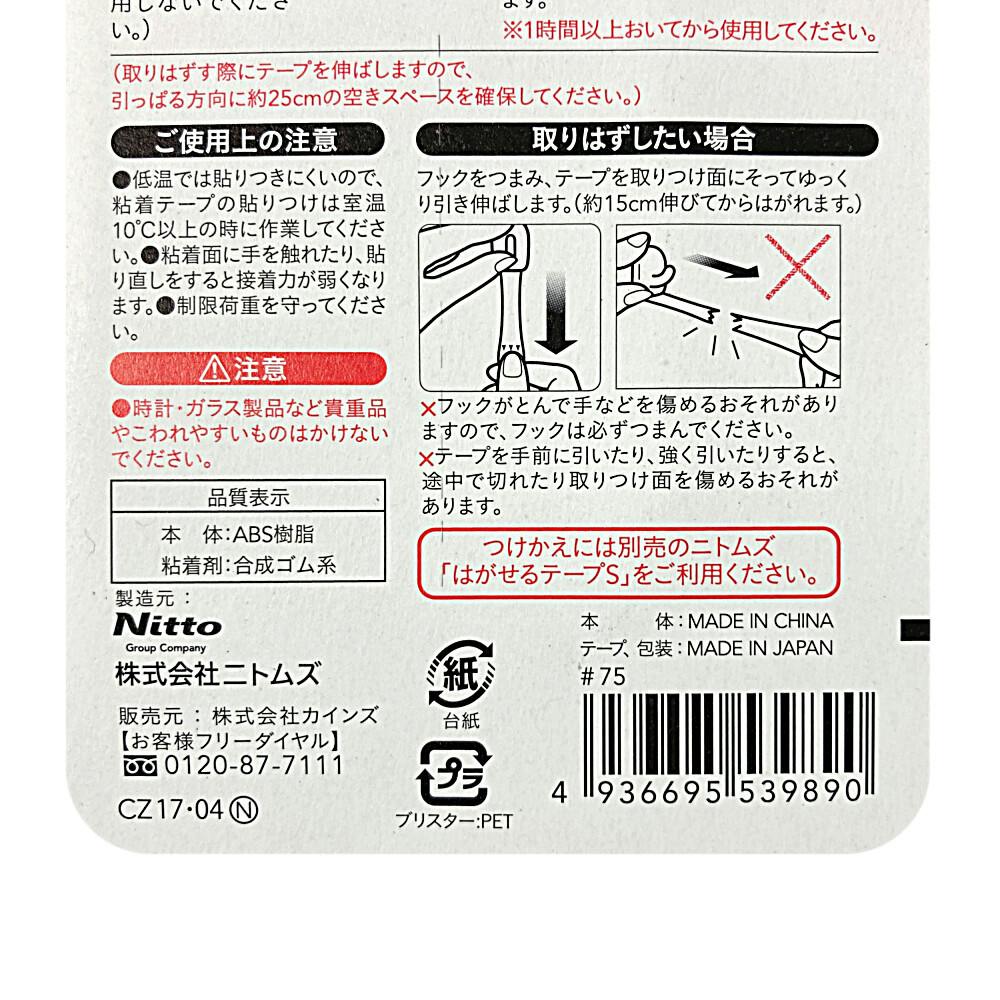 1、取りつけ面のほこり・油・水分・洗剤をよくふきとります。2、テープを白いはくり台紙からはがし、丸い部分を下にしてフックの裏面に貼りつけます。3、赤い文字側のはくり紙をはがし、取りつけ面にフック全体をまんべんなく押しつけ密着させます。