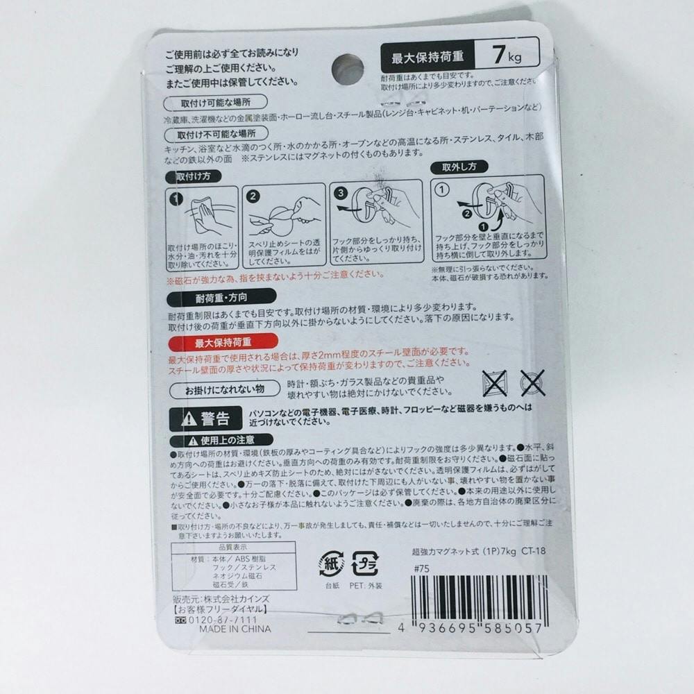 ●取付け場所の材質・環境(鉄板の厚みやコーティング具合など)によりフックの強度は多少異なります。●水平、斜め方向への荷重はお避けください。垂直方向への荷重のみ有効です。耐荷重制限をお守りください。