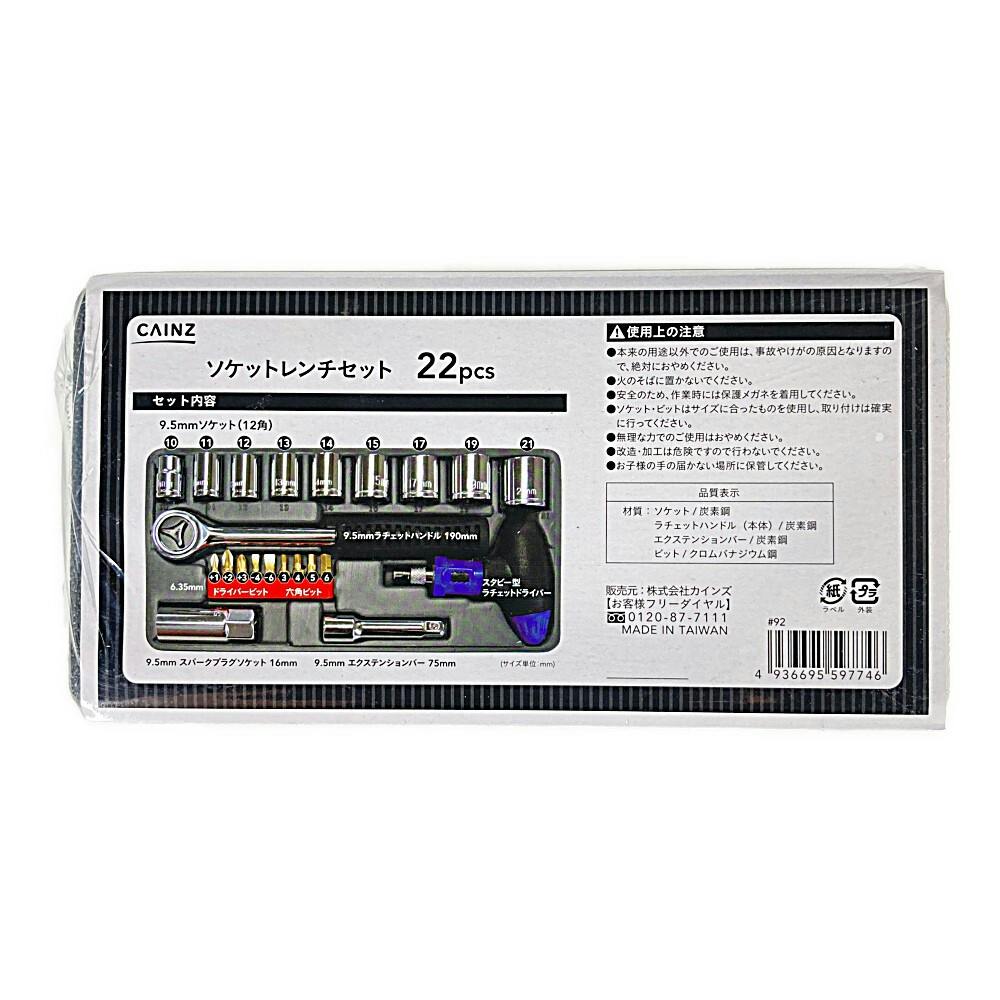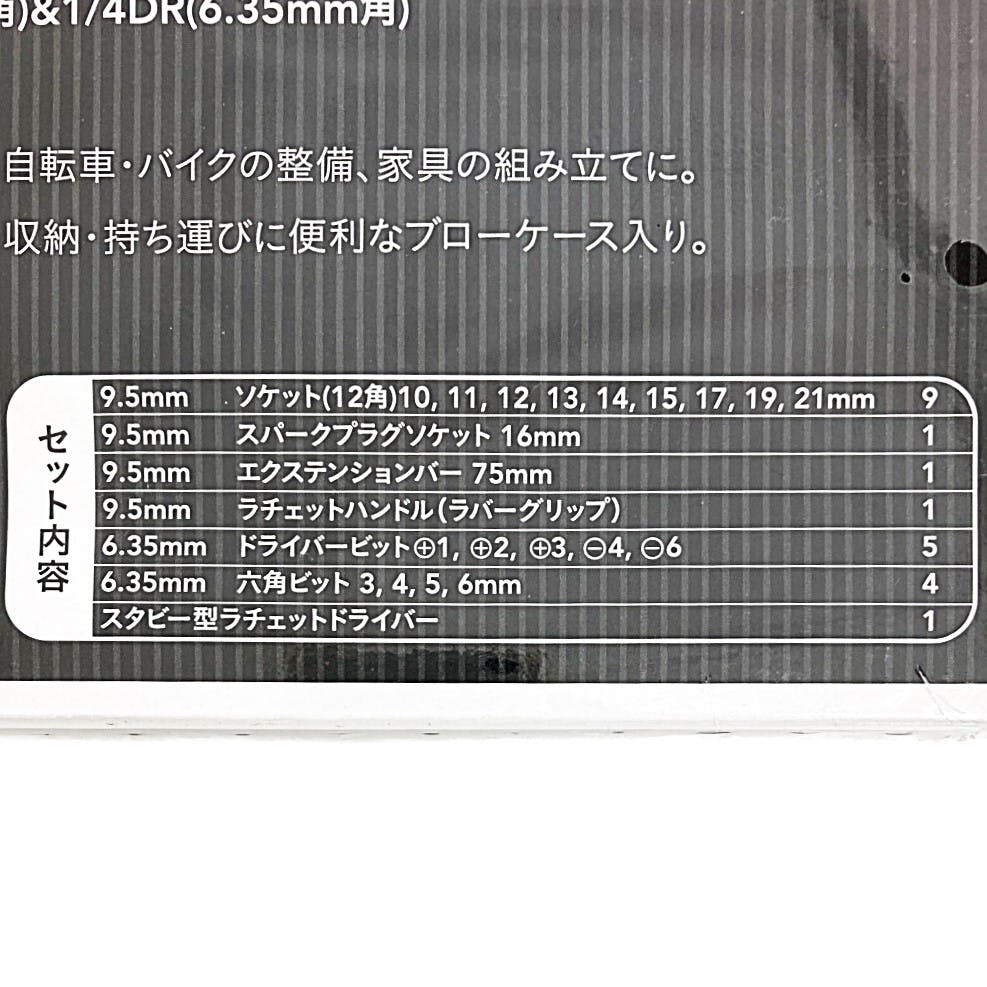●3/8DR(9.5mm角)/ソケット(12角):10~15、17、19、21mm、スパークプラグソケット:16mm、エクステンションバー:75mm、ラチェットハンドル●1/4DR(6.35mm角)/ドライバービット:+1、+2、+3、-4、-6、六角ビット:3~6mm●スタビー型ラチェットドライバー