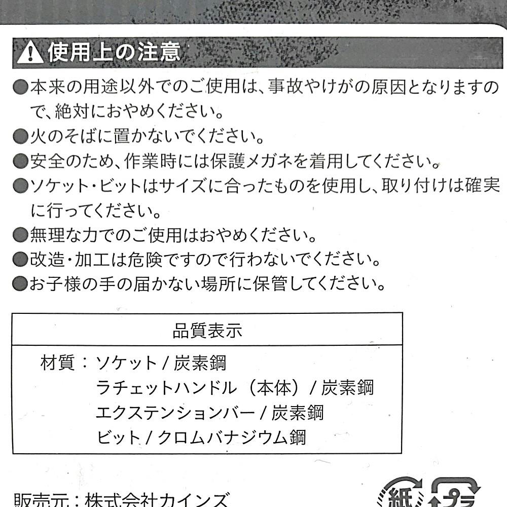 ●ソケット / 炭素鋼 ●ラチェットハンドル(本体)/炭素鋼 ●エクステンションバー / 炭素鋼 ●ビット / クロムバナジウム鋼