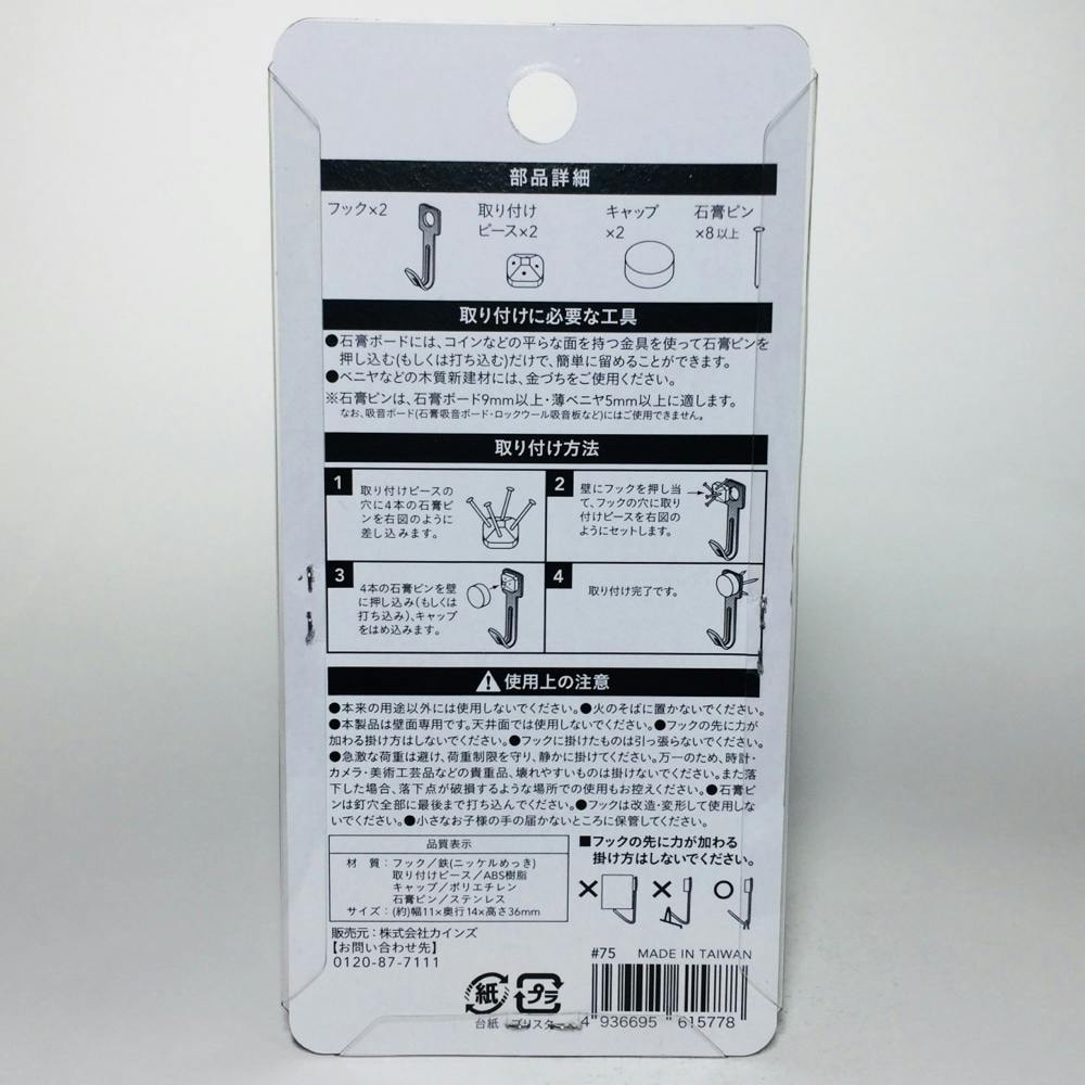 ●フック/鉄(ニッケルめっき) ●取り付けピース/ABS樹脂 ●キャップ/ポリエチレン ●石膏ピン/ステンレス