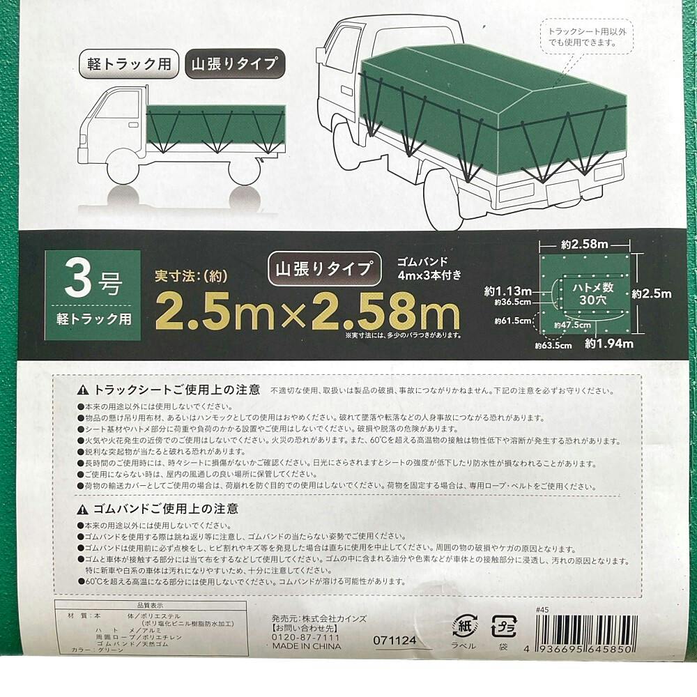 ●樹脂防水加工●強い帆布地●抜群の耐候性●軽トラック用●山張りタイプ●トラックシート用以外でも使用できます。●ゴムバンド4m×3本付き●ハトメ数:30穴●ハトメ間隔(外)/縦:61.5cm、横:63.5cm●ハトメ間隔(内)/縦:36.5cm、横:47.5cm