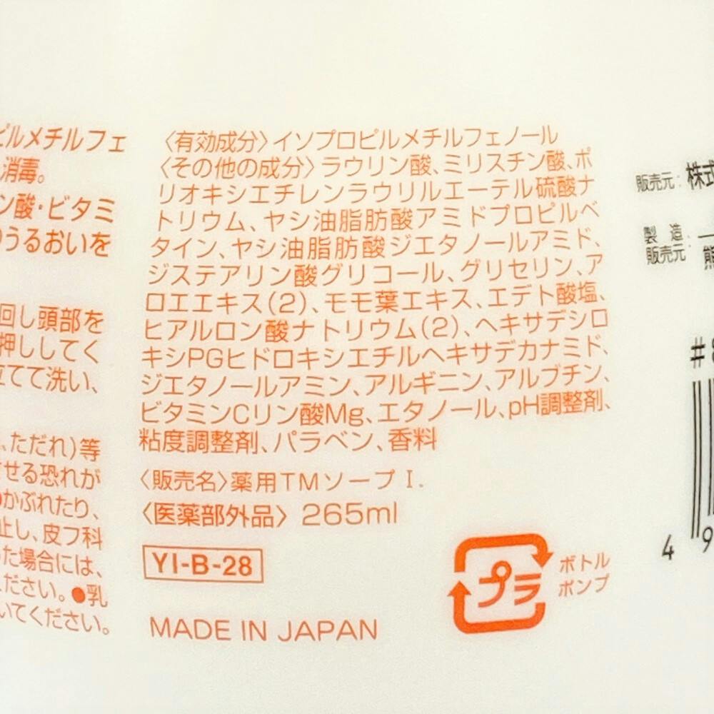 ●有効成分/イソプロピルメチルフェノール ●その他の成分/ラウリン酸、ミリスチン酸、ポリオキシエチレンラウリルエーテル硫酸ナトリウム、ヤシ油脂肪酸アミドプロピルベタイン、ヤシ油脂肪酸ジエタノールアミド、ジステアリン酸グリコール、グリセリン、など