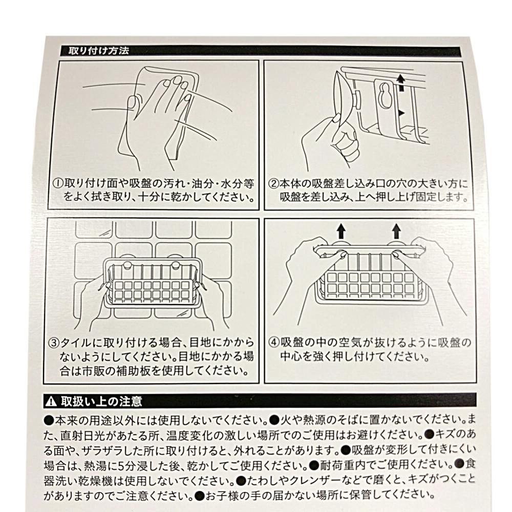 ●取り付け面や吸盤の汚れ・油分・水分等をよく拭き取り、十分に乾かしてください。●本体の切れ込みの向きに注意し、吸盤を取り付けてください。●タイルに取り付ける場合、目地にかからないようにしてください。目地にかかる場合は市販の補助板を使用してください。