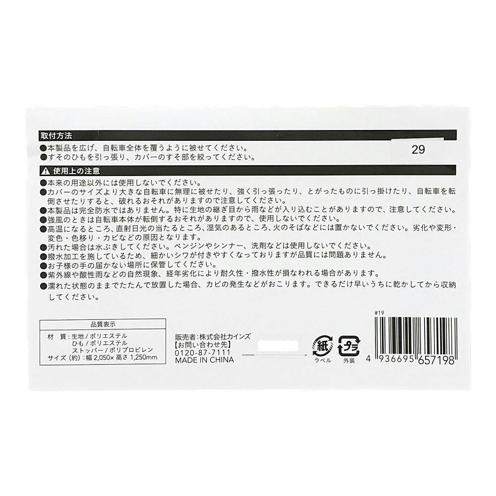 ●引張強度に優れたポリエステル製。●撥水加工生地で、雨やホコリから自転車をガード。