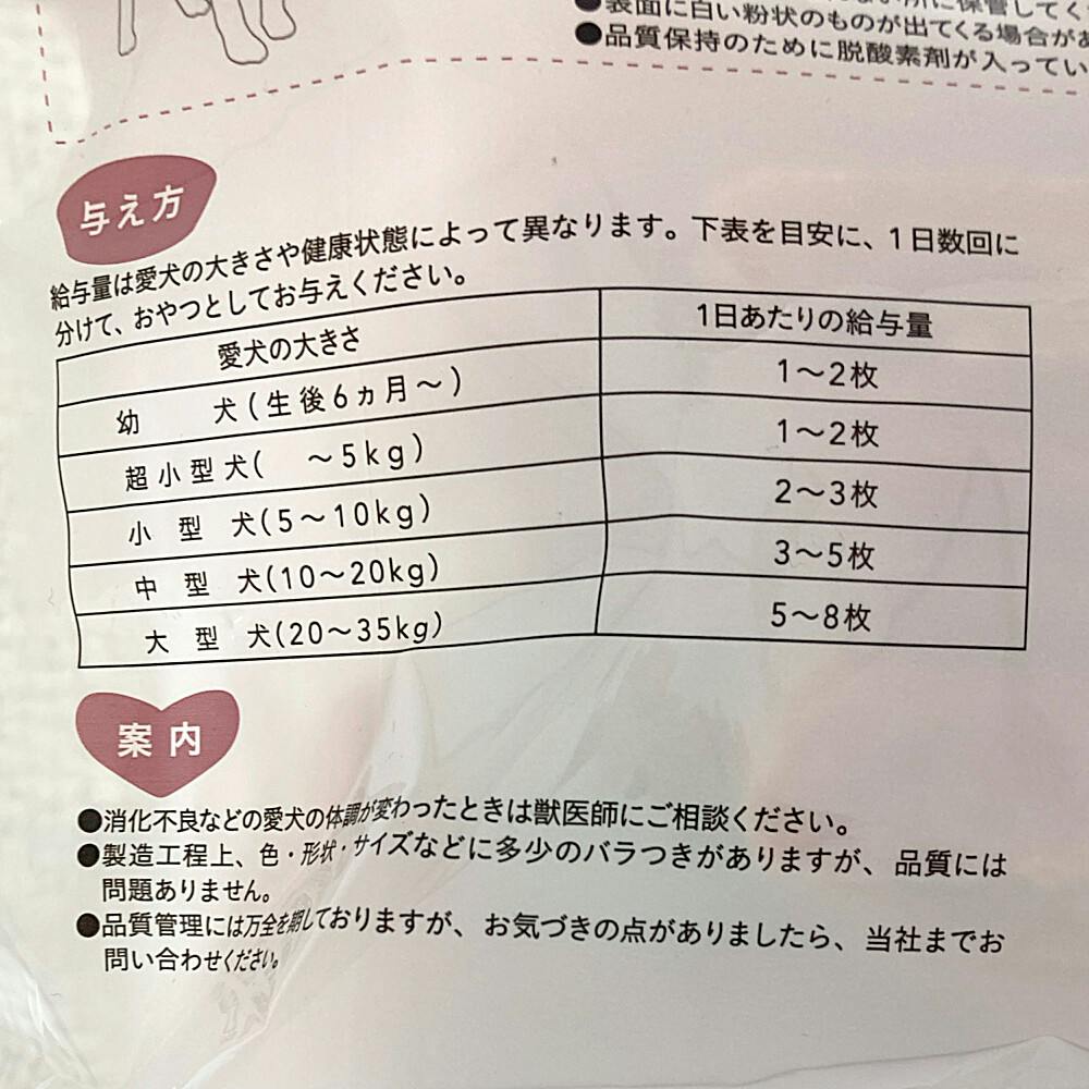 1日数回に分けて、おやつとしてお与えください。1日あたりの給与量●幼犬(生後6ヶ月~):1~2枚●超小型犬(~5kg):1~2枚●小型犬(5~10kg):2~3枚●中型犬(10~20kg):3~5枚●大型犬(20~35kg):5~8枚