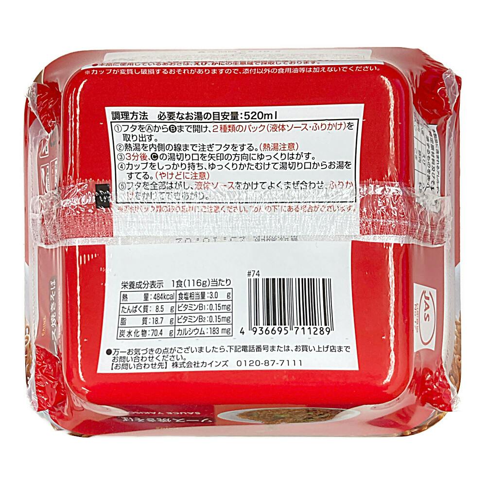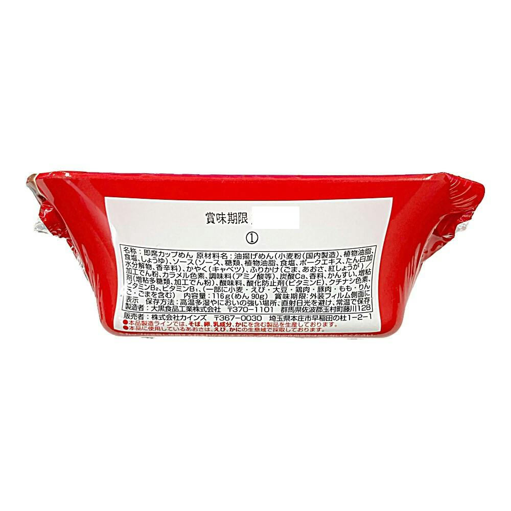 めん(小麦粉(国内製造)、植物油脂、食塩、しょうゆ)、ソース(ソース、糖類、植物油脂、食塩、ポークエキス、たん白加水分解物、香辛料)、かやく(キャベツ)、 ふりかけ(ごま、あおさ、紅しょうが)/加工でん粉、カラメル色素、調味料(アミノ酸等)、炭酸Ca、香料、かんすい、など