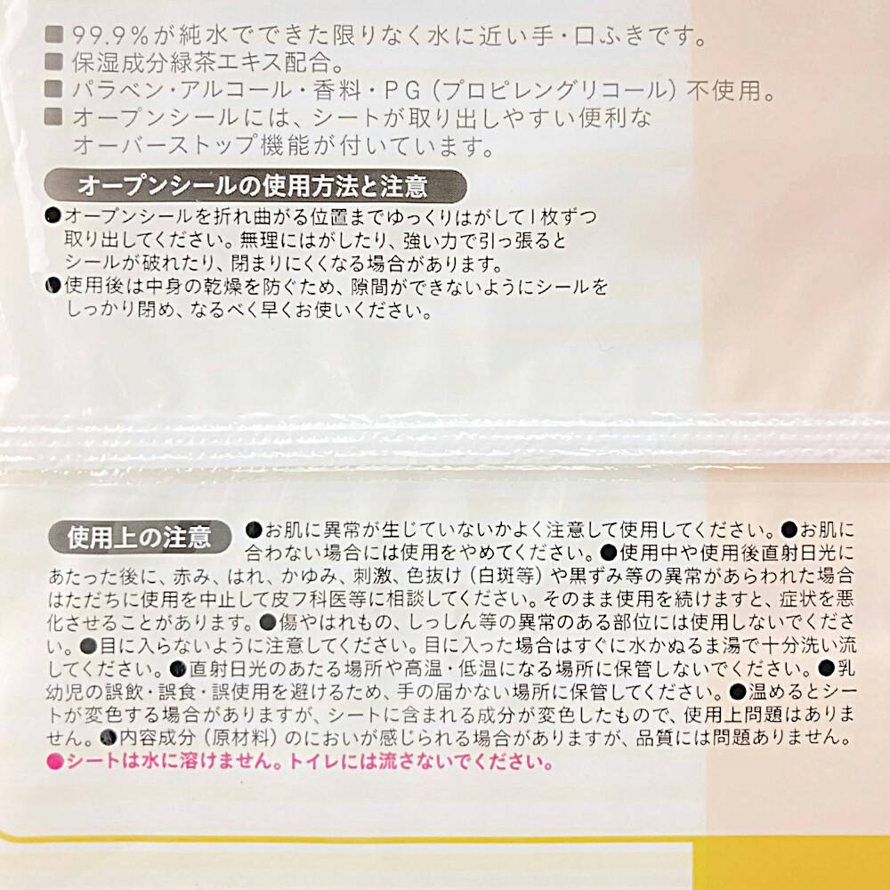 ●99.9%が純水でできた限りなく水に近い手、口ふきです。●パラベン、アルコール、香料、PG(プロピレングリコール)不使用。●オープンシールには、シートが取り出しやすい便利なオーバーストップ機能が付いています。●保湿成分緑茶エキス配合。