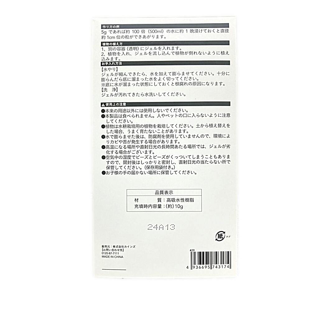 ●水やり/ジェルが縮んできたら、水を加えて膨らませてください。十分に膨らんだら底に溜まった水をよく切ってください。●底に水が溜まった状態にしておくと根腐れの原因になります。●洗浄/ジェルが汚れてきたら水洗いしてください。