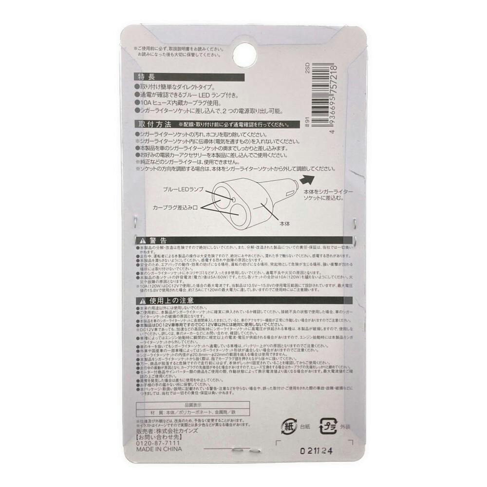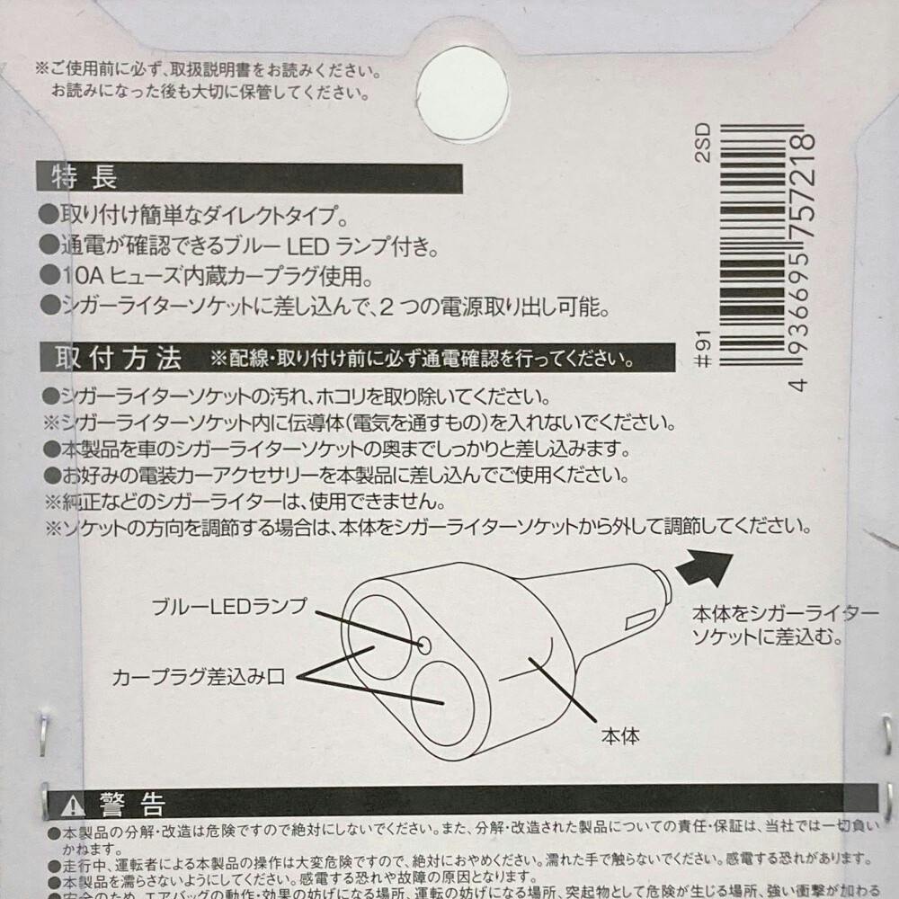 ●取り付け簡単なダイレクトタイプ。●通電が確認できるブルーLEDランプ付き。●10Aヒューズ内蔵カーブラグ使用。●シガーライターソケットに差し込んで、2つの電源取り出し可能。