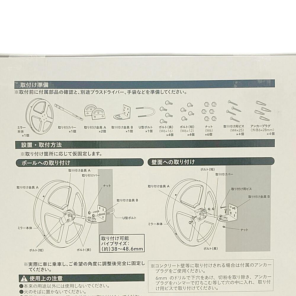 ミラー本体、取り付けバー、取り付け金具A×2個、取り付け金具B、U型ボルト、ボルト(長)(M6×16)×4個、ボルト(短)(M6×12)×4個、ナット(M6)×6個、取り付け用ビス(M4×25)×4個、アンカープラグ(外径6×28mm)×4個