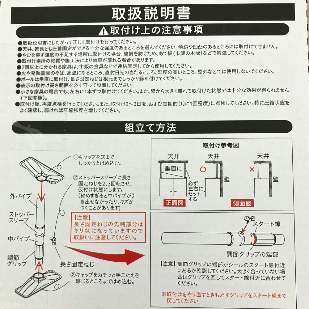 1.調節グリップ側を下にし、家具端部にキャップをセットします。2.外パイプを垂直に天井いっぱいまで持ち上げた状態にし、長さ固定ねじをしっかり締めつけて中パイプを固定します。3.調節グリップをに徐々に回して圧着固定させます。等