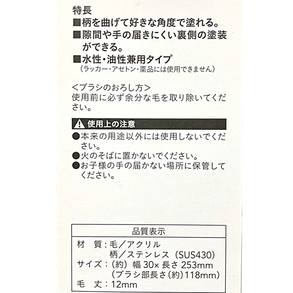 ●柄を曲げて好きな角度で塗れる。●隙間や手の届きにくい裏側の塗装ができる。●水性・油性兼用タイプ(ラッカー・アセトン・薬品には使用できません)