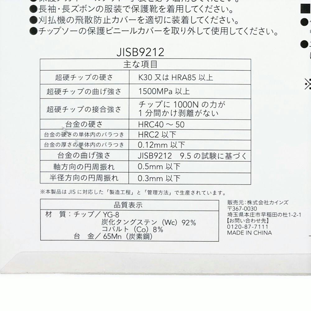 ●チップ/YG-8炭化タングステン(Wc):92%、コバルト(Co):8% ●台金/65Mn(炭素鋼)