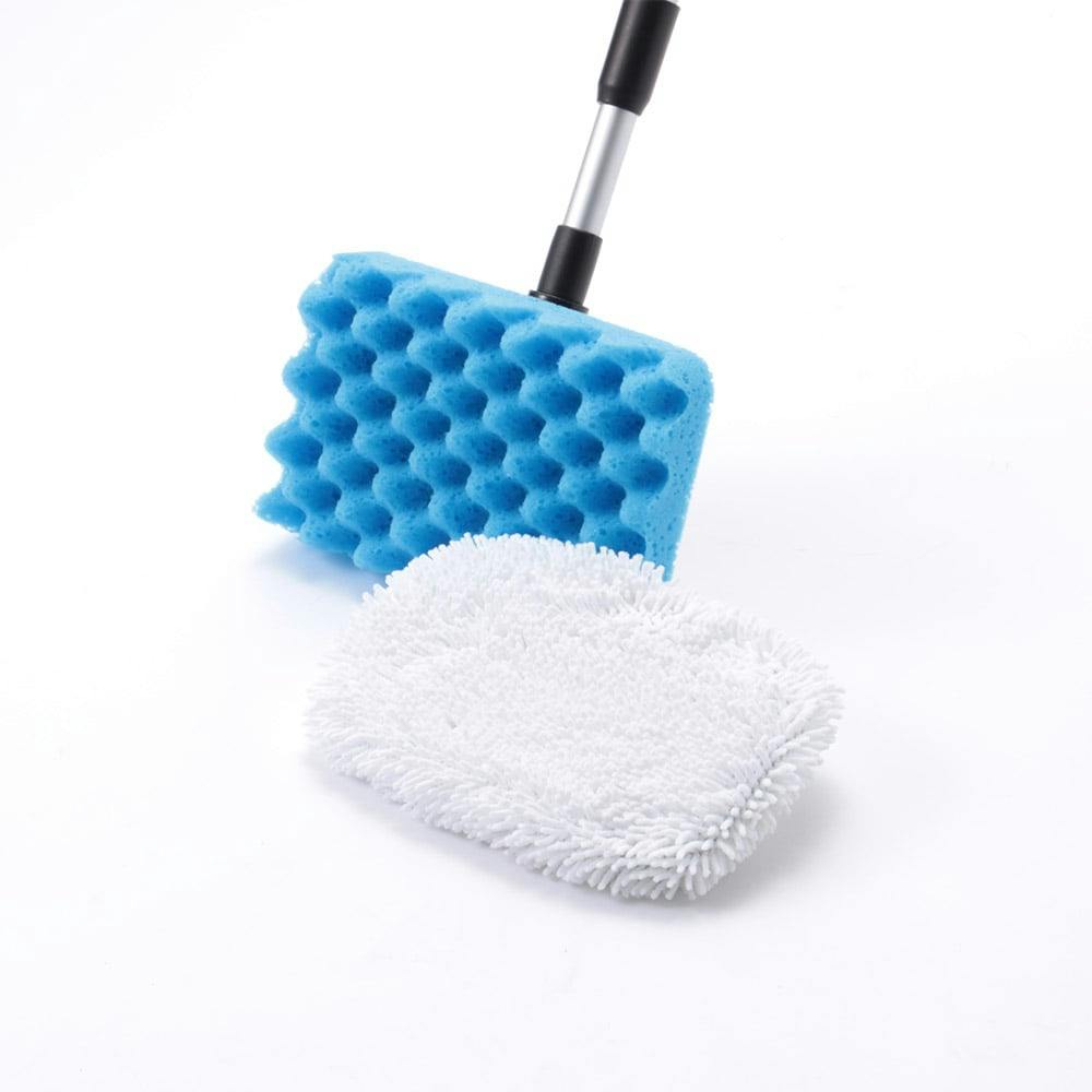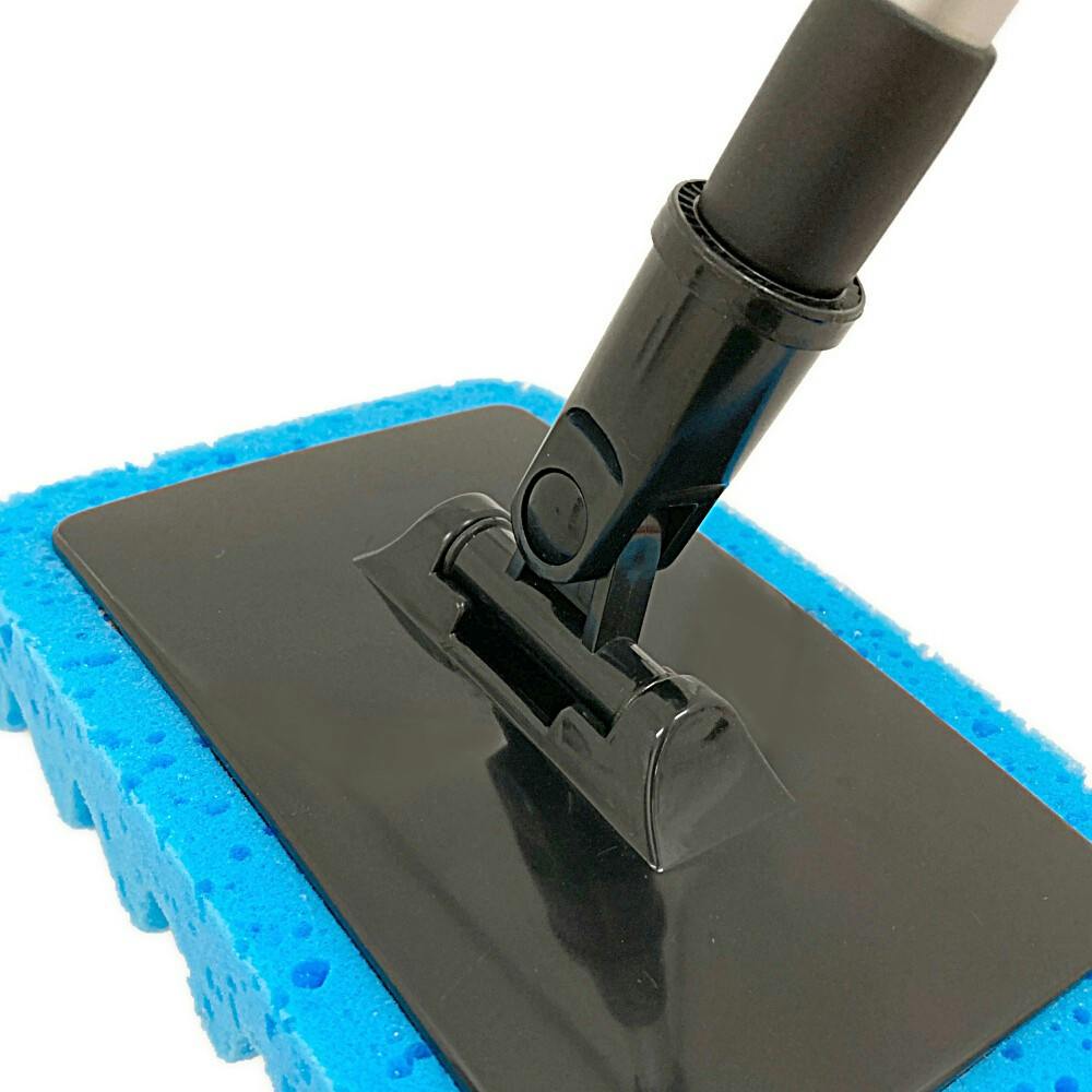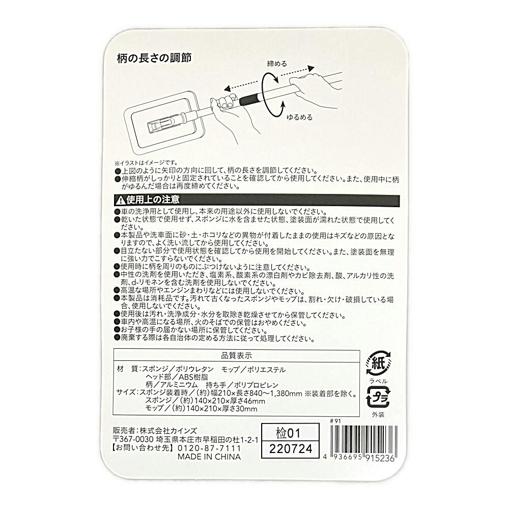 ●スポンジで洗って、モップで拭き取る。●伸縮柄だから、高い所もラクラク洗車。