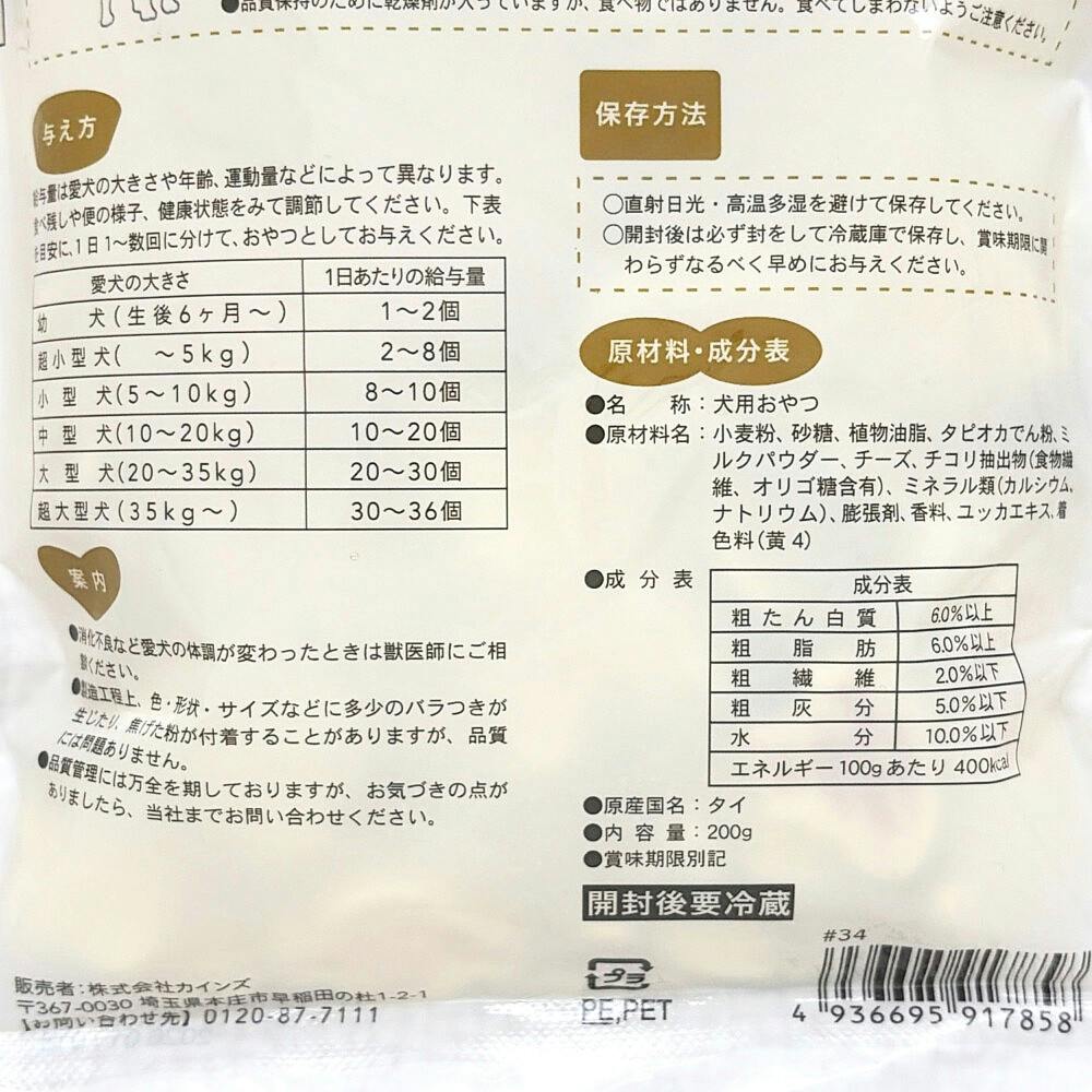 ●給与量は愛犬の大きさや年齢、運動量などによって異なります。食べ残しや便の様子、健康状態をみて調節してください。●1日1~数回に分けて、おやつとしてお与えください。
