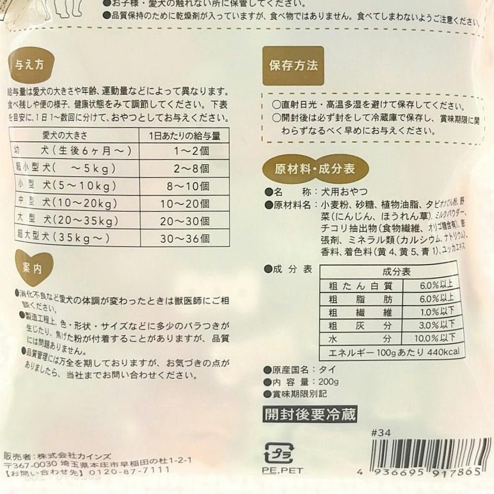●給与量は愛犬の大きさや年齢、運動量などによって異なります。食べ残しや便の様子、健康状態をみて調節してください。●1日1~数回に分けて、おやつとしてお与えください。