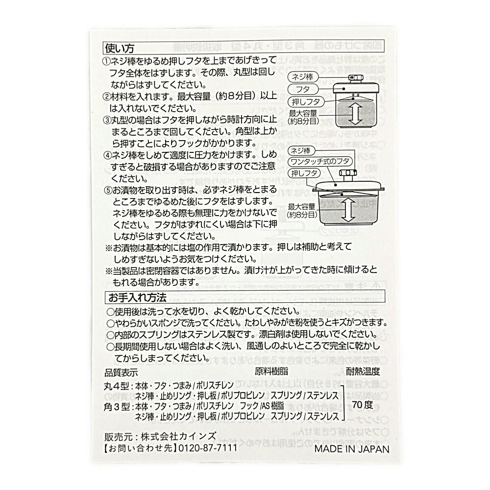 ●本製品はつけもの容器です。用途以外では使用しないでください。●火のそばに置かないでください。●お子様の手の届かない場所に保管してください。