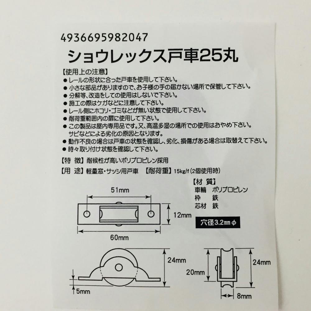 ●レールの形状にあった戸車を使用して下さい。●小さな部品がありますので、お子様の手の届かない場所で保管して下さい。●分解等、改造しての使用はしないで下さい。●施工の際にケガなどに注意して下さい。●耐荷重範囲内の扉に使用して下さい。