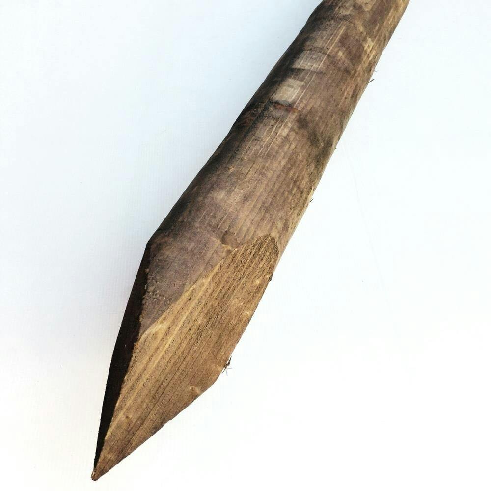 防腐加工(茶)を施し、防腐効果を付加した杭。無加工の杭に比べ、地中の水分吸収を抑え、長く品質を保つ