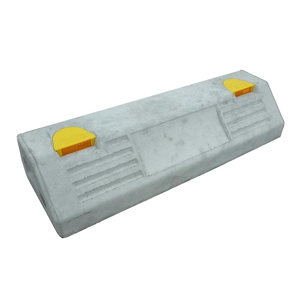 反射板の付いたコンクリート製の車止めです。反射板のキャップを外すとアンカーを打つ穴があります。
