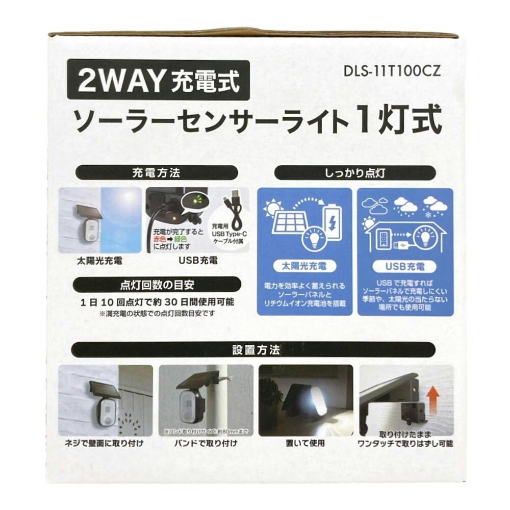 2WAY充電式センサーライト ソーラー式1灯 DLS-11T100CZ 防犯 太陽光/USB充電式 赤外線探知 防雨構造 約300ルーメン