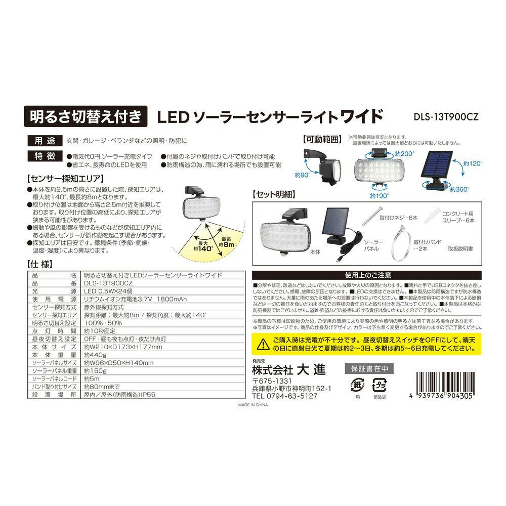明るさ切替え付きセンサーライト ソーラー式 ワイド DLS-13T900CZ