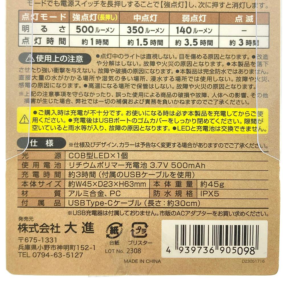 ●強点灯:500ルーメン●中点灯:350ルーメン●弱点灯:140ルーメン