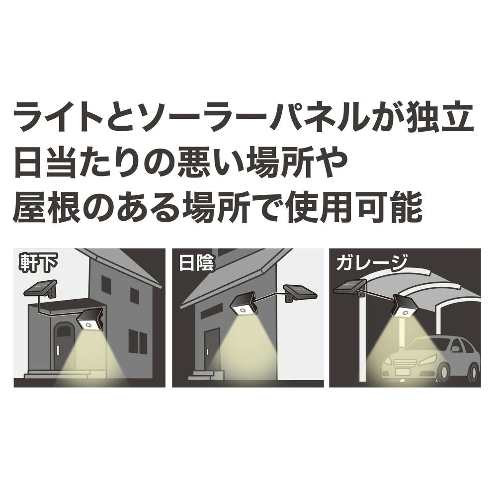 ライトとソーラーパネルが独立しているから、日当たりの悪い場所や屋根のある場所でも使用可