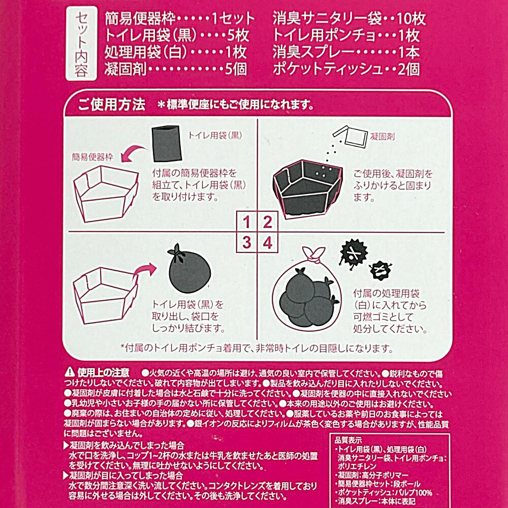 簡易便器枠x1、トイレ用袋(黒)x5、処理用袋(白)x1、凝固剤x5、消臭サニタリー袋x10、トイレ用ポンチョx1、消臭スプレーx1、ポケットティッシュx2