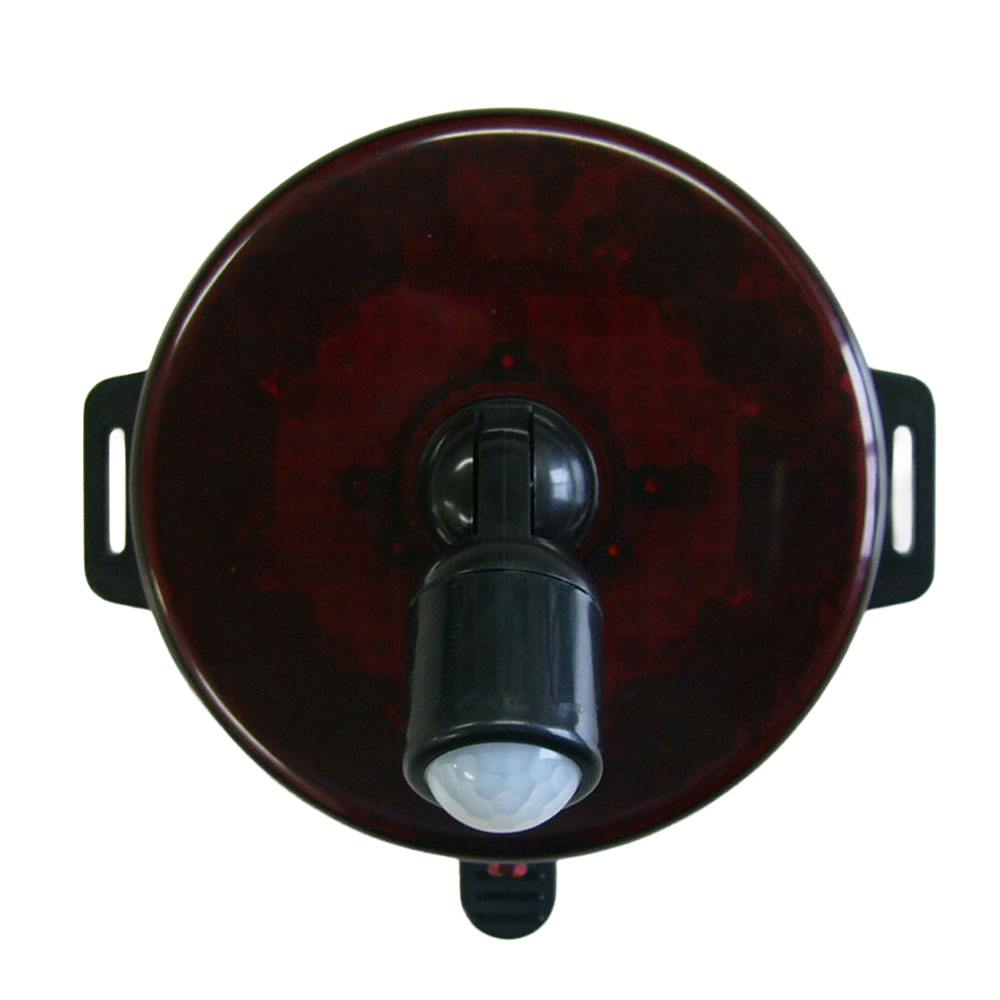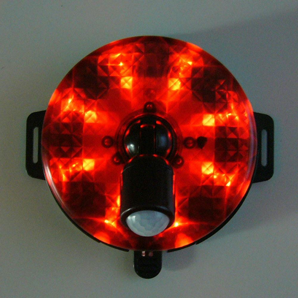 8個のLEDがクルクル回転・ピカピカ点滅。車や動物の動きも感知します(感知範囲5mまで)。方向可変センサー搭載でセンサーを目的物の方向に向けることができます。感知対象が前にいると動作し続けます。光だけ/音だけ/光と音の選択が可能です。屋内/屋外に設置可能です。