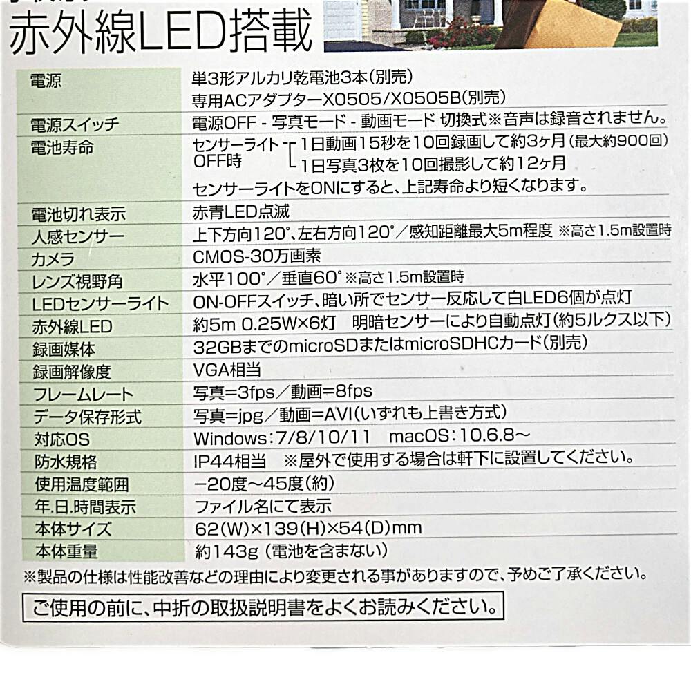 電池寿命/センサーライトOFF時 動画を1日10回録画して約3カ月。※センサーライトがONの時は短くなります。録画媒体/32GBまでのmicroSDまたはmicroSDHCカード(別売)。カメラ:CMOS-30万画素。防水規格IP44相当。
