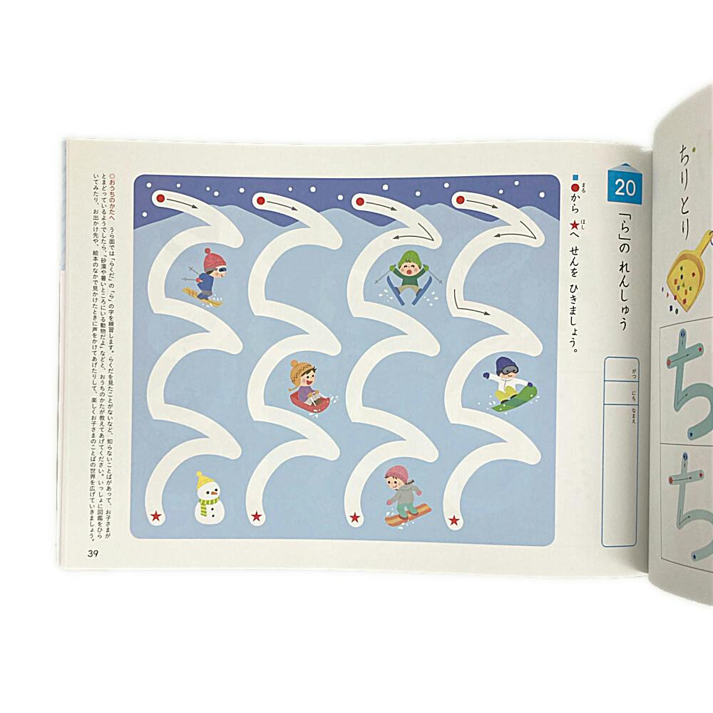 線の練習と、ひらがなの練習を交互にくり返しながら、書きやすい順に、ひらがな清音24文字を練習します。運筆力をのばしながら、無理なく楽しくひらがなを覚えます。