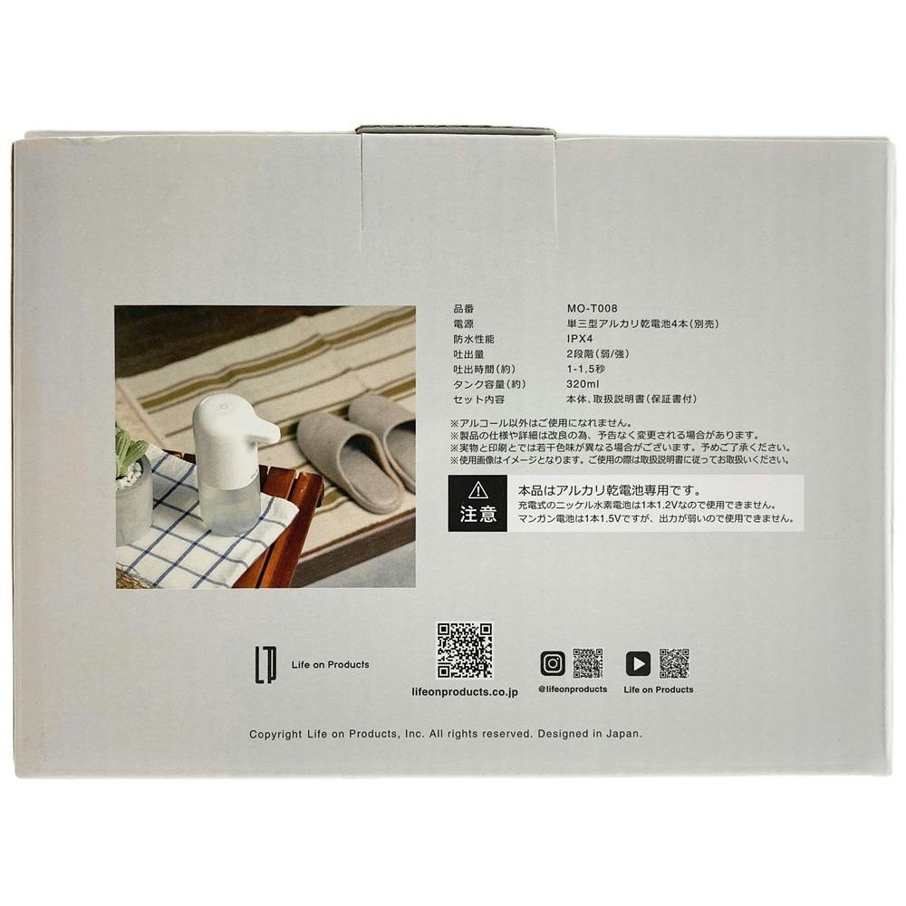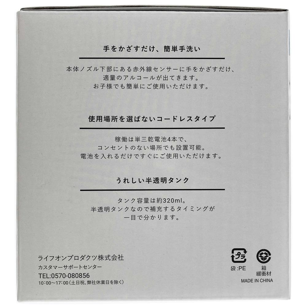 ●対応洗剤:アルコール ●電源:単三型アルカリ乾電池4本(別売り) ●防水性能:IPX4 ●吐出量:2段階(弱・強) ●吐出時間(約):1-1.5秒 ●タンク容量(約):320ml