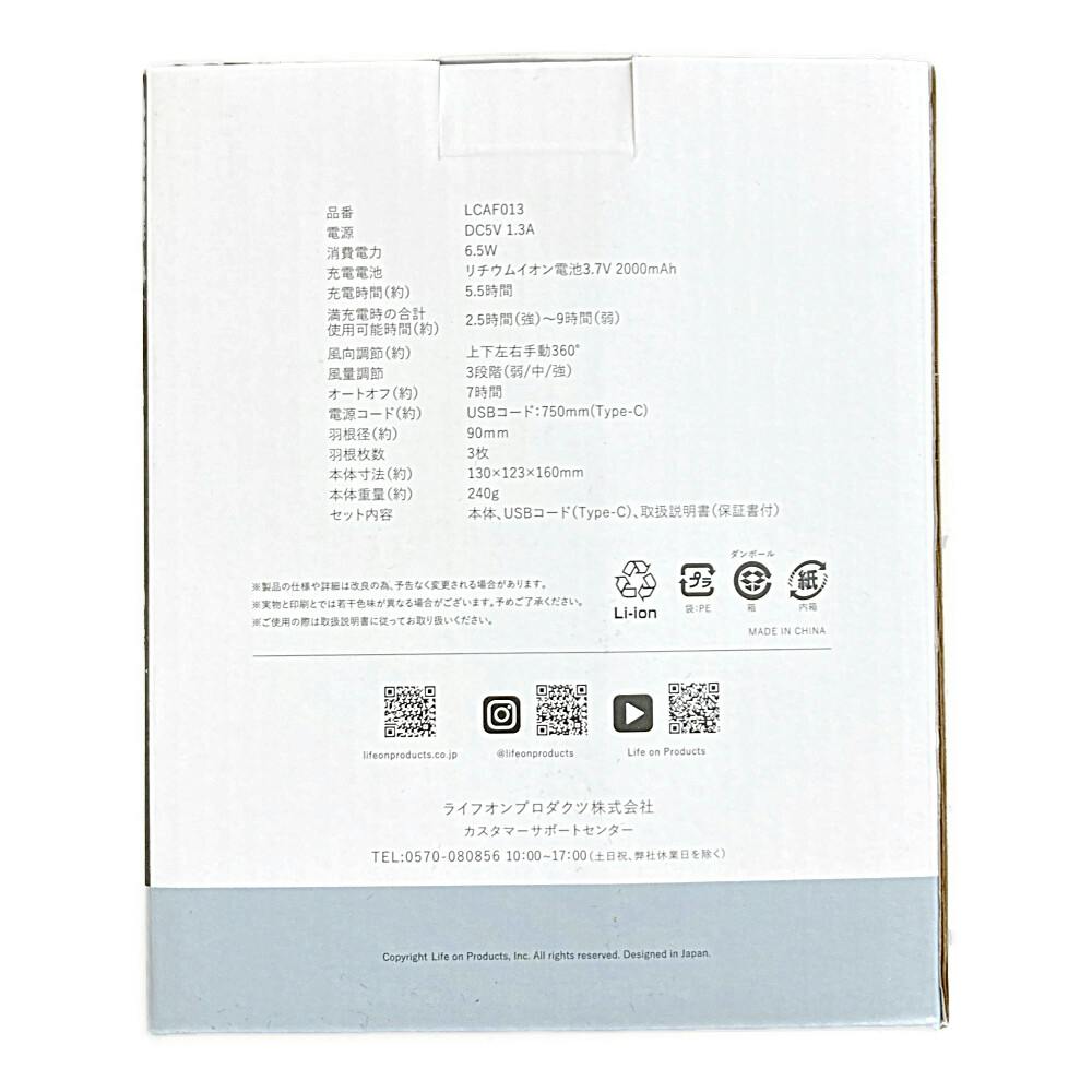 充電時間(約)5.5時間、連続使用可能時間最大(約)9時間、上下左右360°風向調節